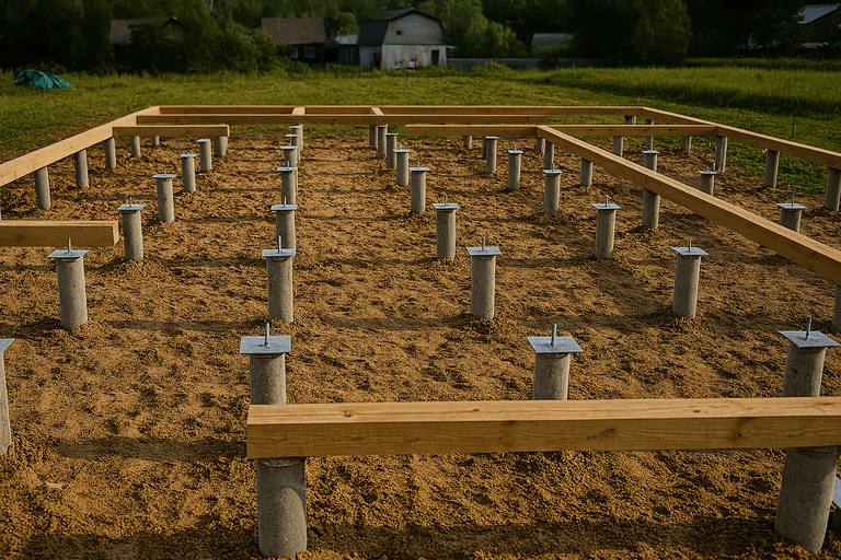 Выполняется монтаж опалубки и армирование. Затем заливается бетон для создания ростверка — горизонтальной балки, соединяющей все сваи в единую конструкцию. - Контроль качества и выдержка бетона